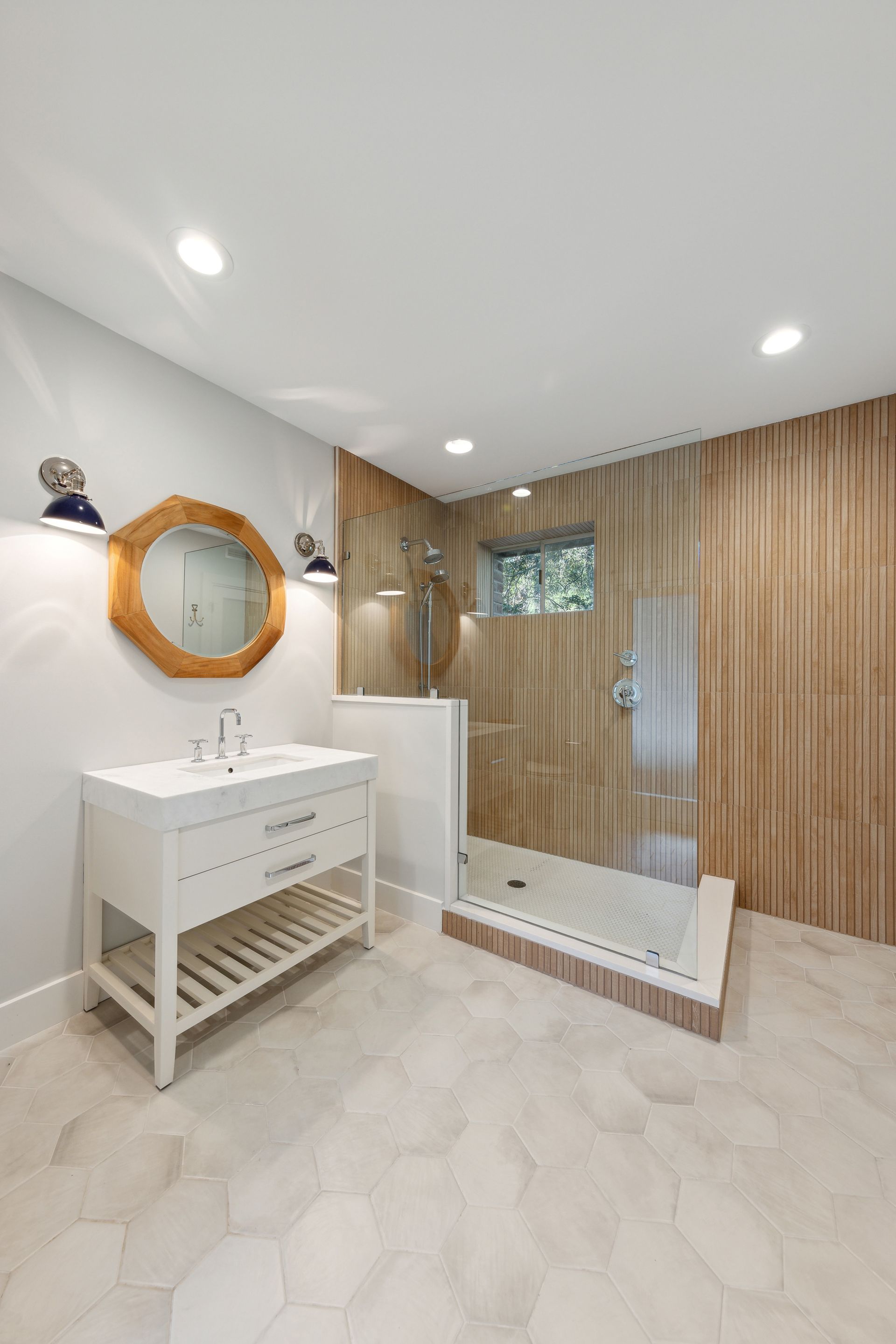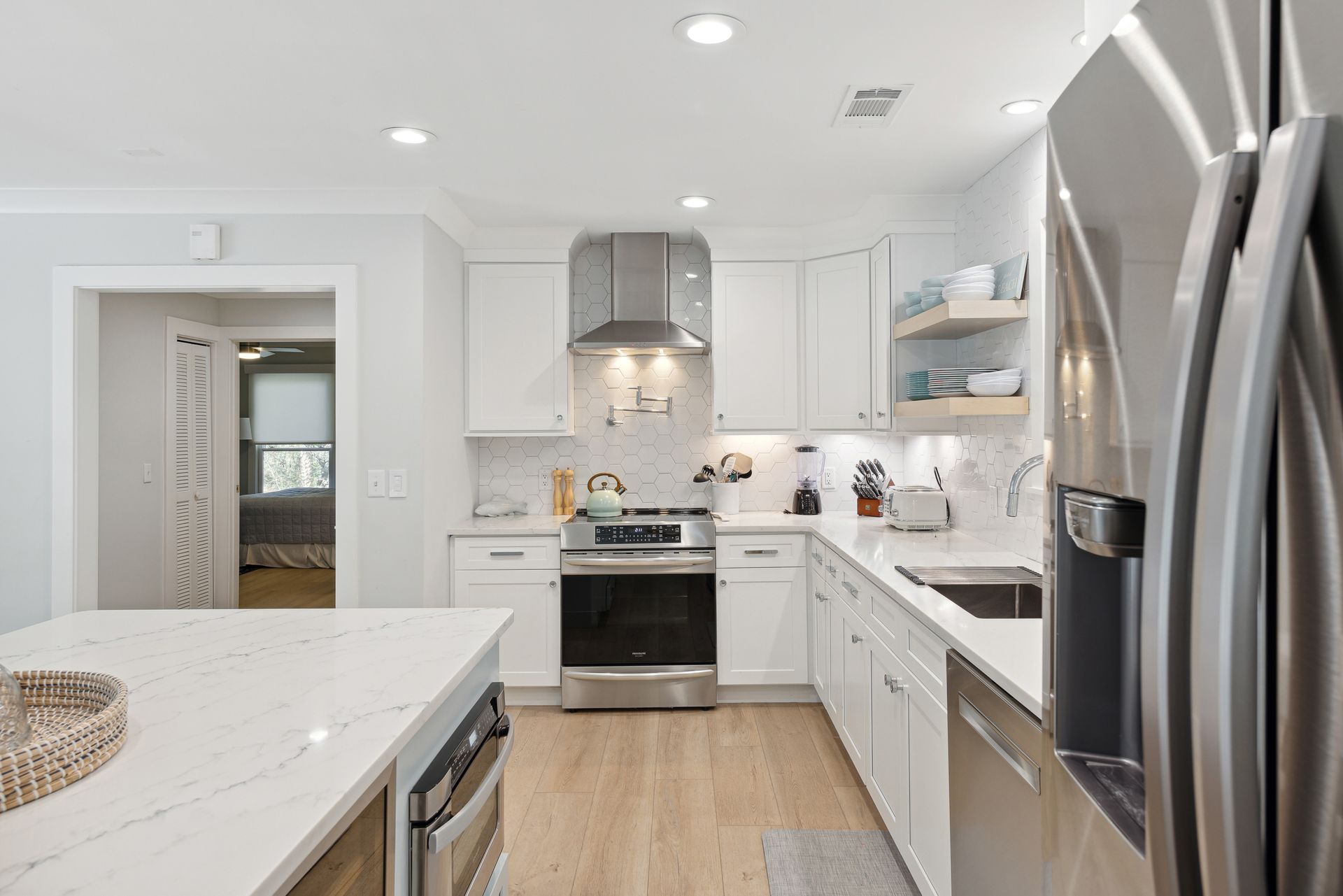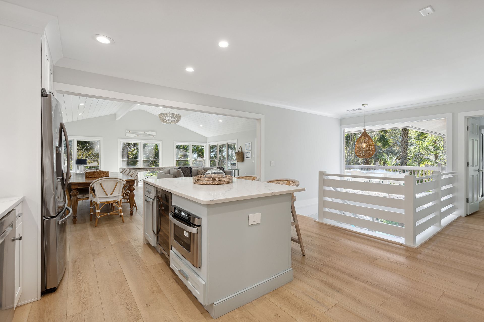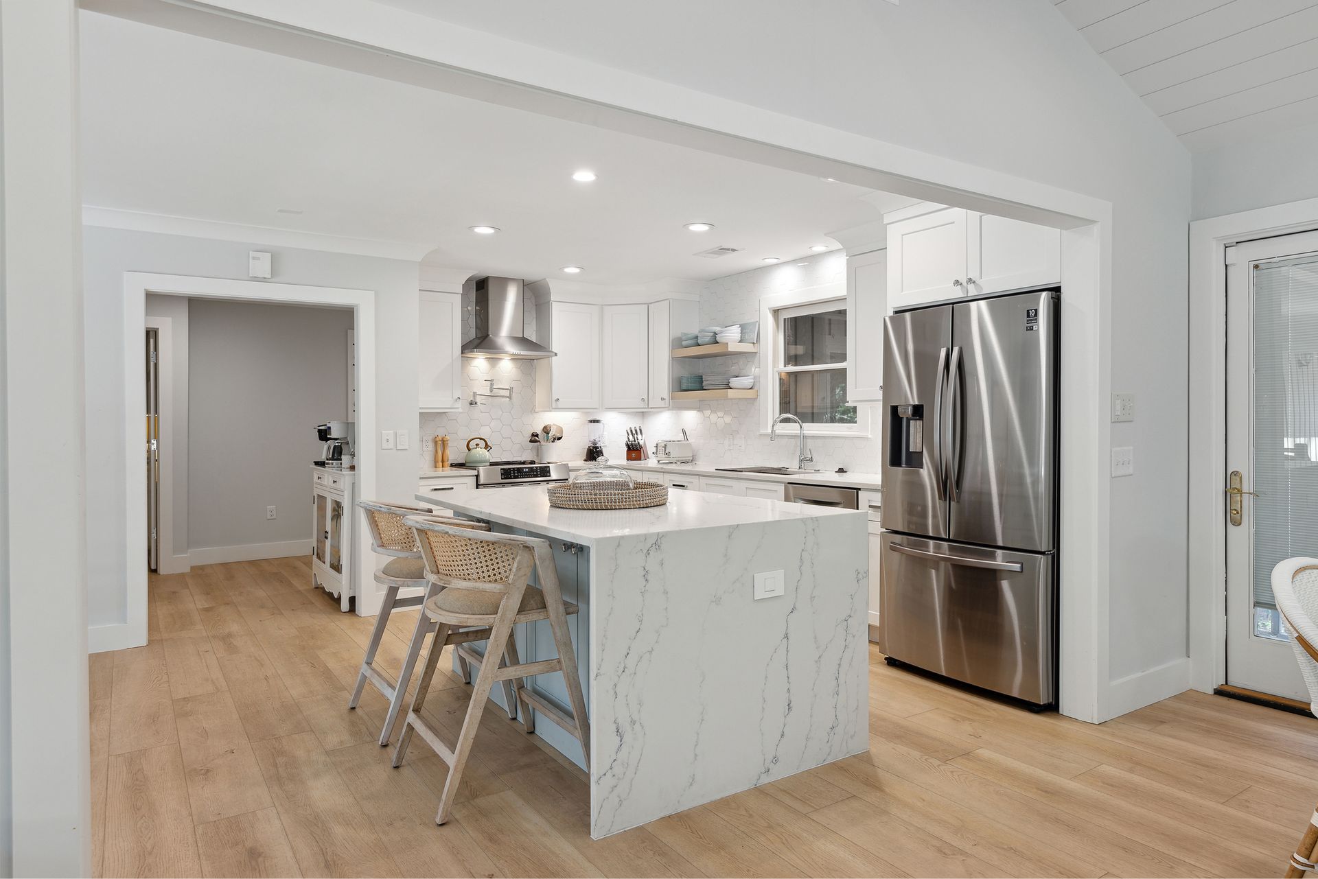 This stunning home was remodeled with a coastal chic style, featuring vaulted ceilings, shiplap accents, and an open-concept layout perfect for entertaining. The updated kitchen and bathrooms boast modern finishes, while the addition of two spacious bedrooms enhances the home's functionality. A two-story screened-in porch extends the living space, offering a serene retreat with beautiful outdoor views. The result is a stylish, airy home that combines relaxed coastal charm with contemporary comforts.